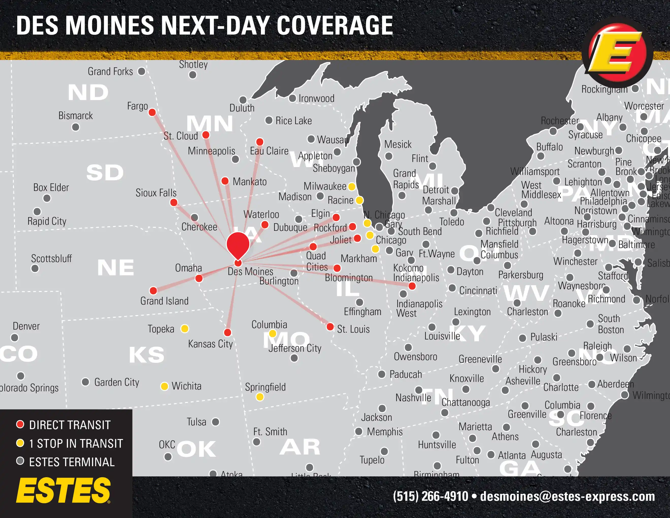 Estes offers next-day direct LTL freight shipping from Des Moines to Indianapolis, Kansas City, St. Louis, Omaha, Sioux Falls, Joliet, Fargo, Bloomington, and Rockford, as well as next-day LTL to Chicago, Milwaukee, Wichita, Topeka, Columbia, Springfield, and more. Learn about the benefits of shipping through this hub terminal.