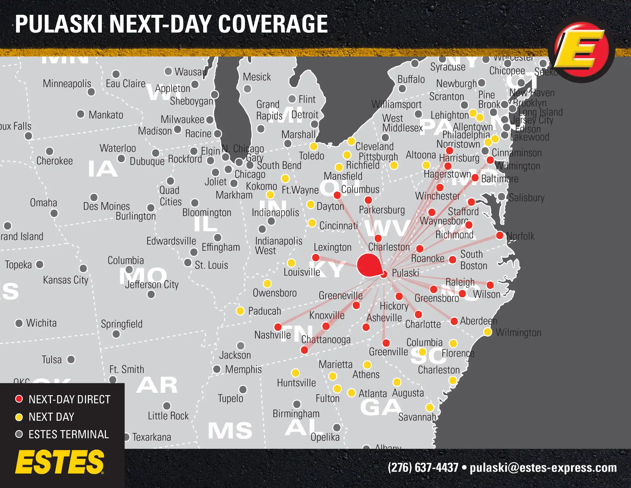 Estes offers next-day direct LTL freight shipping from the Blacksburg-Wytheville-Abingdon area to Charlotte, Nashville, Columbus, Baltimore, Raleigh, Lexington, and Norfolk, as well as next-day LTL to Atlanta, Philadelphia, Cincinnati, Cleveland, Pittsburgh, Louisville, Toledo, Huntsville, Charleston, and more. Learn about the benefits of shipping through this hub terminal.